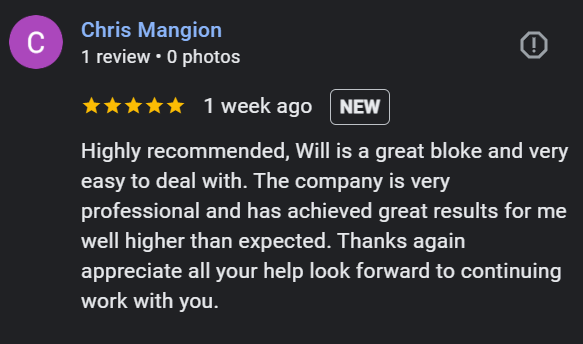 "Highly recommended, Will is a great bloke and very easy to deal with. The company is very professional and has achieved great results for me well higher than expected. Thanks again appreciate all your help look forward to continuing work with you."